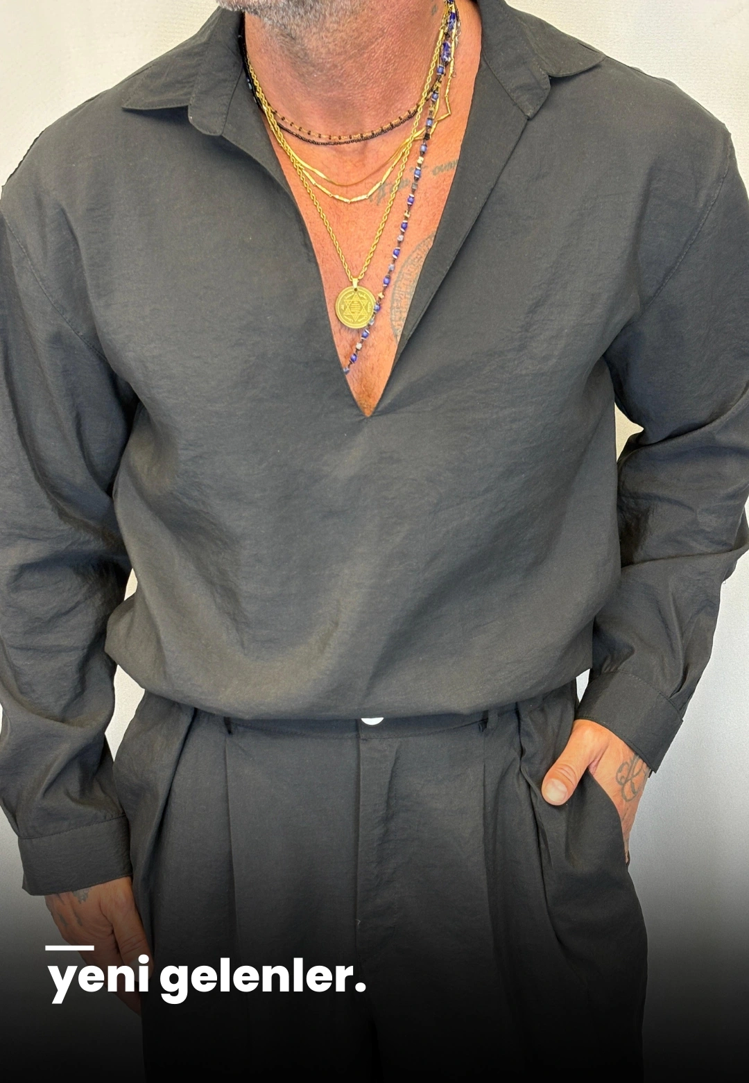 Modal V Yaka Uzun Kol Gömlek Gri