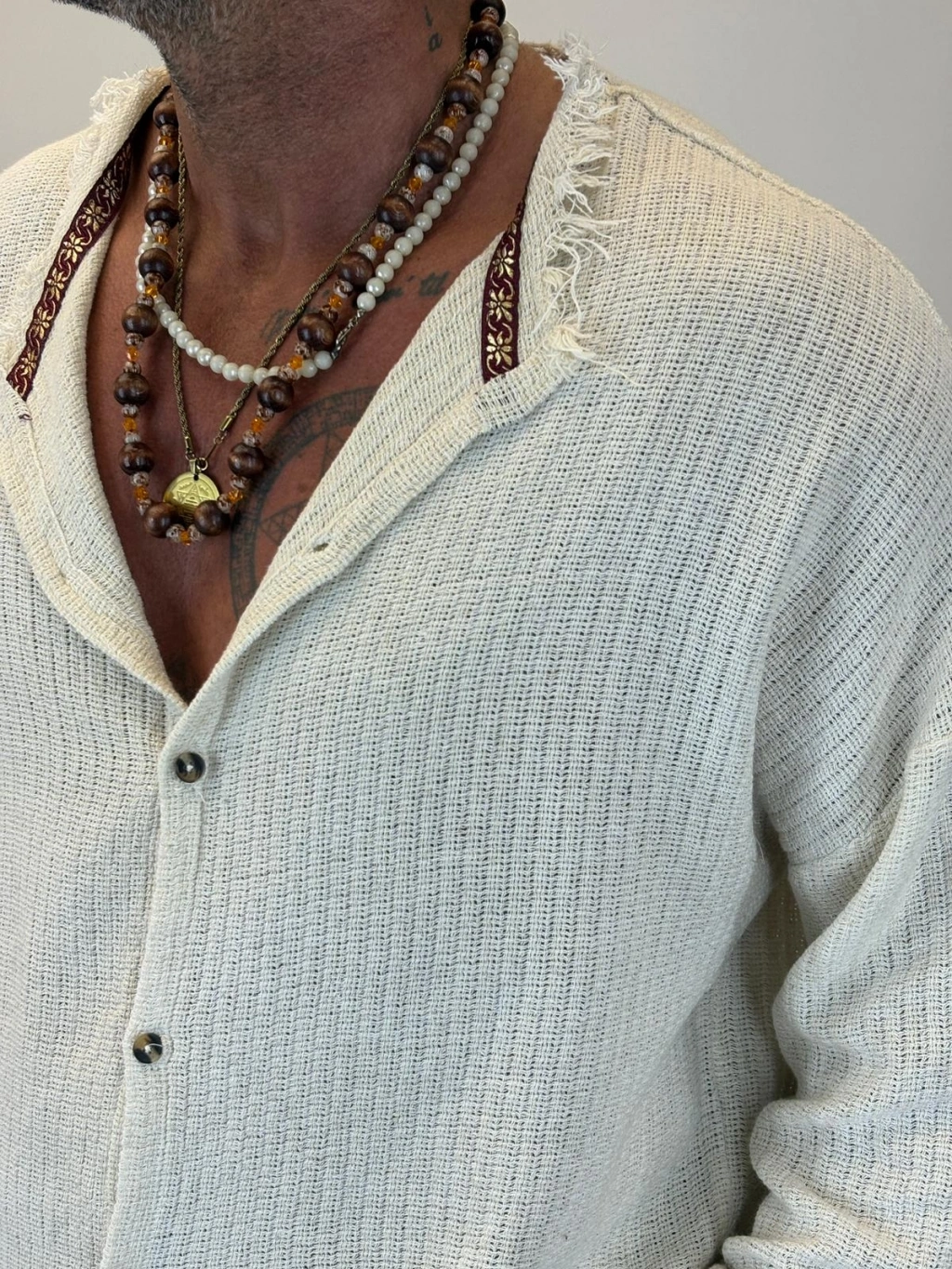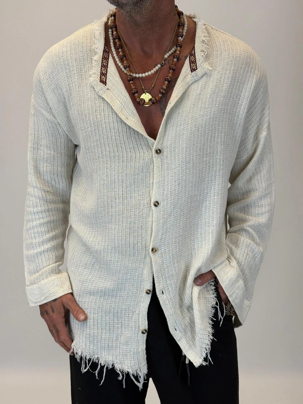 Hasır Bohem Şeritli Gömlek Ekru
