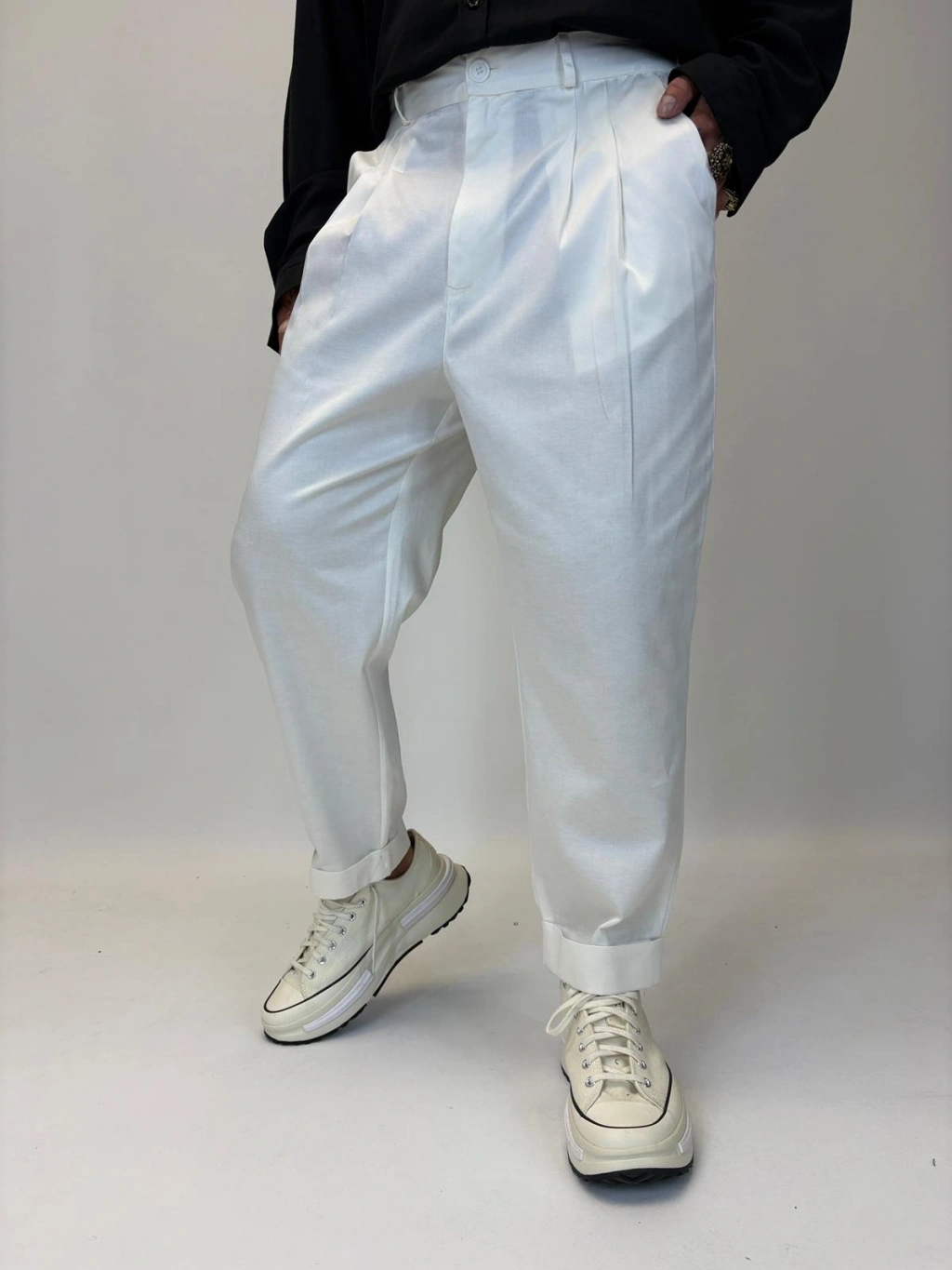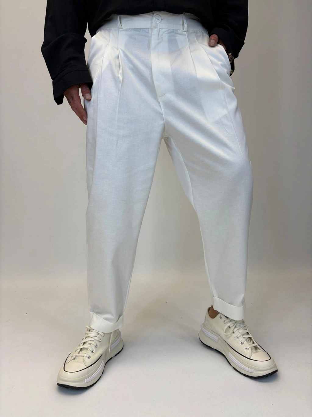 İtalyan Double Paça Pileli Pamuk Saten Pantolon Beyaz