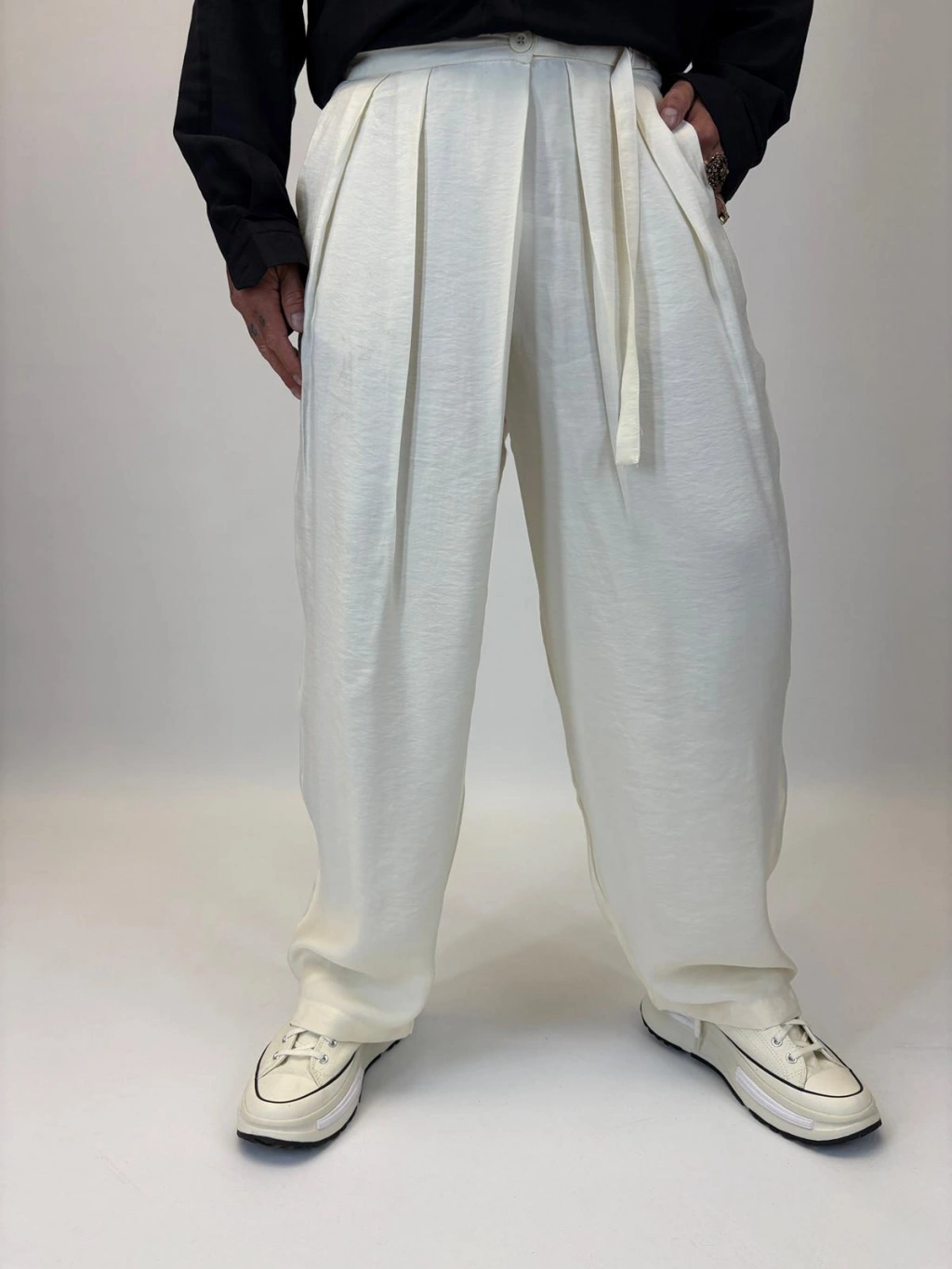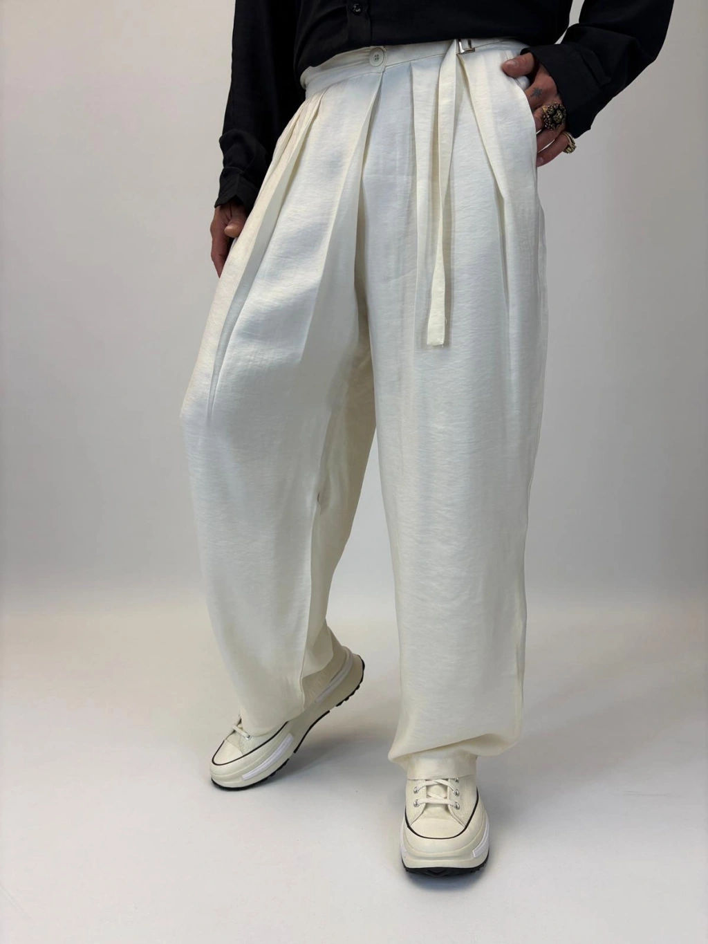 Organic Tesla Kemer Detaylı Pileli Pantolon Beyaz