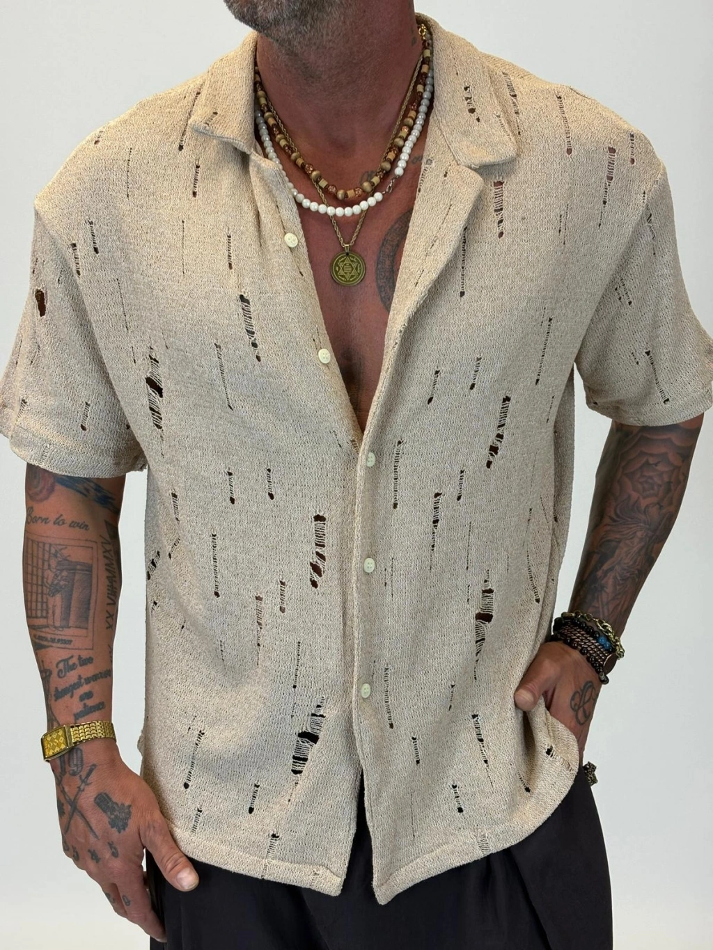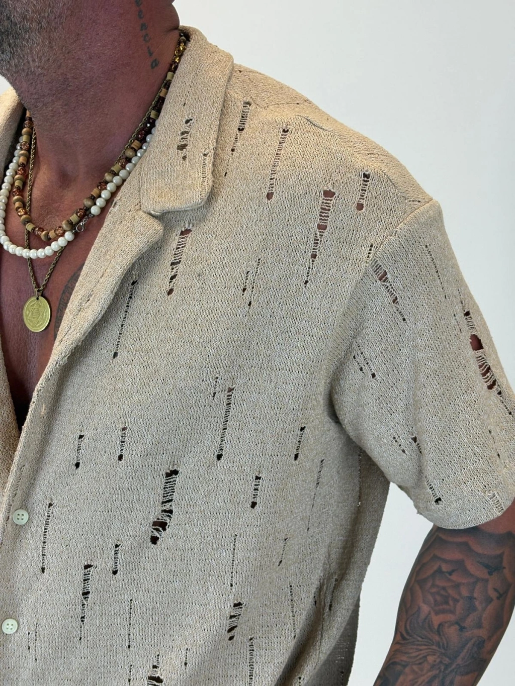 Triko Akrilik Yıpratma Gömlek Bej