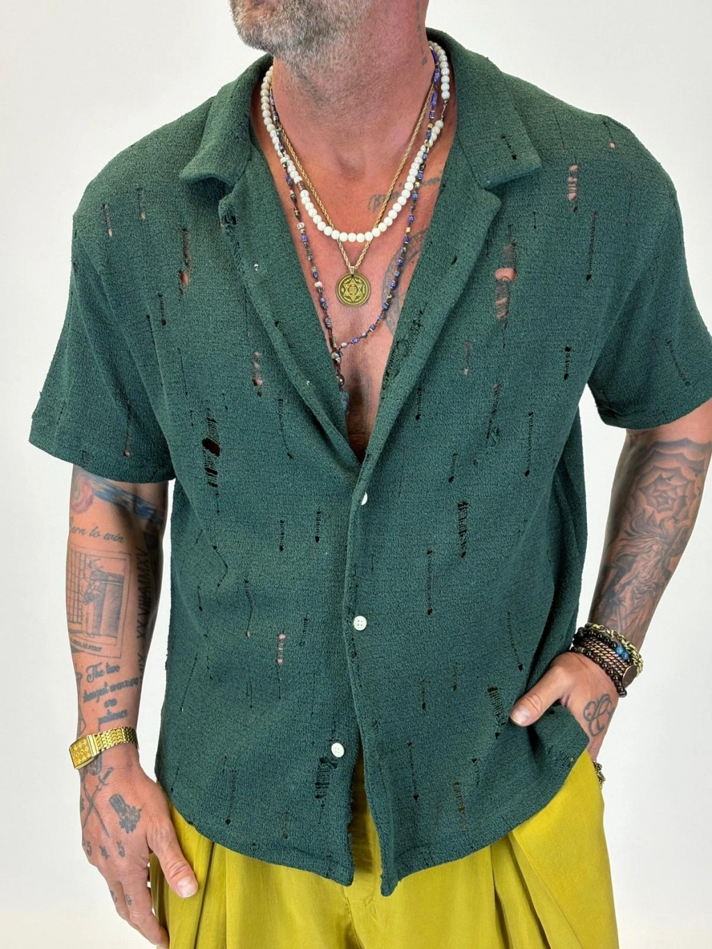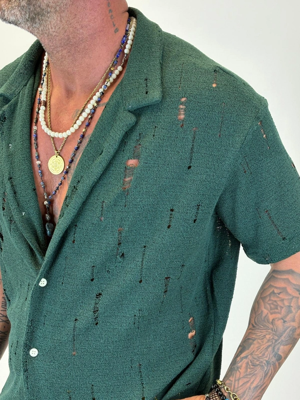 Triko Akrilik Yıpratma Gömlek Koyu Yeşil
